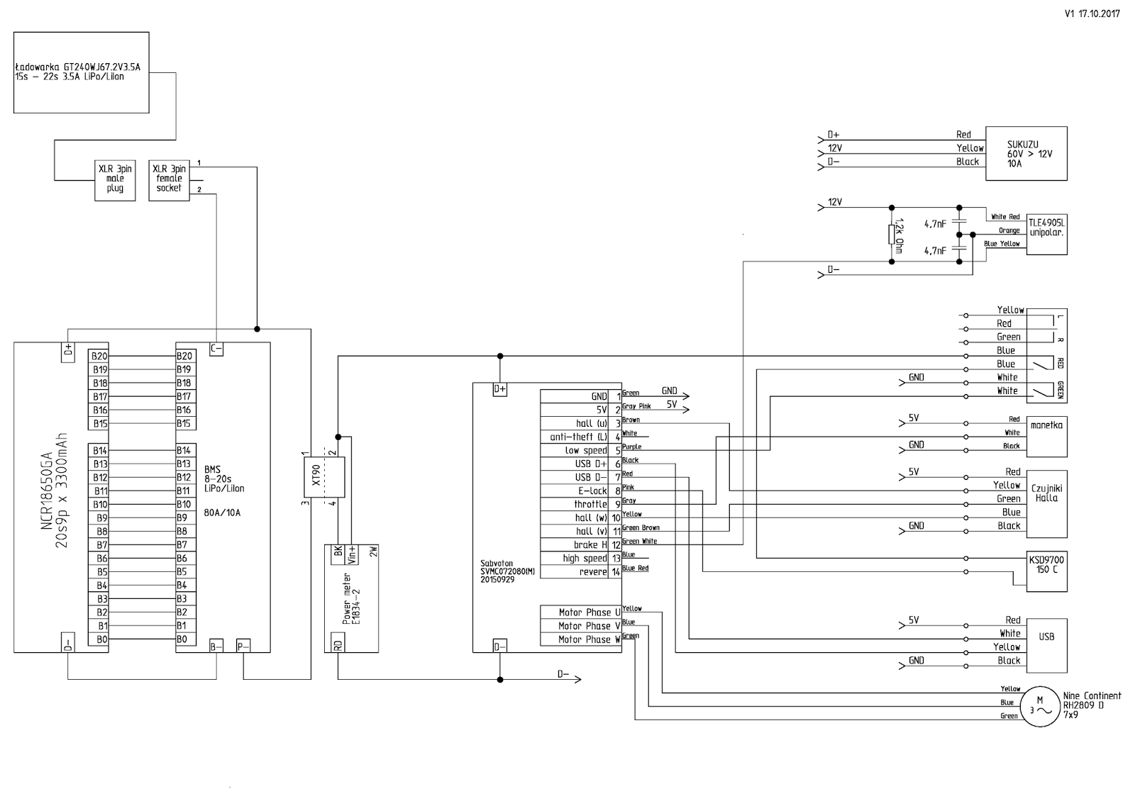 - akumulator 20s9p x Sanyo NCR18650GA (3233mAh), 60V-84V, 29Ah, 2,15kWh,